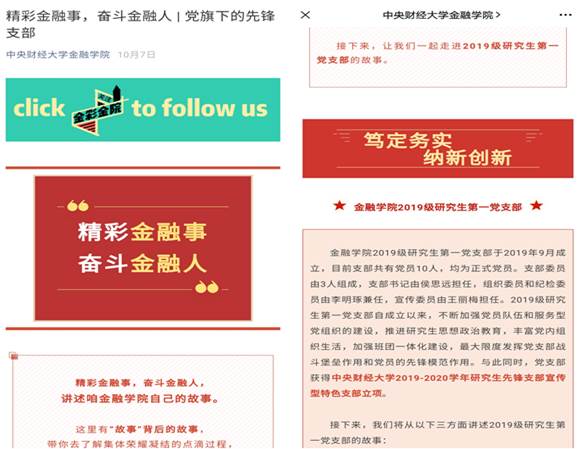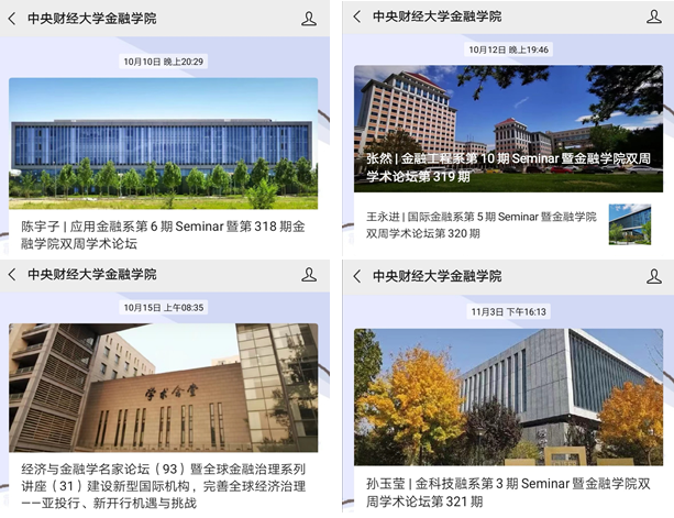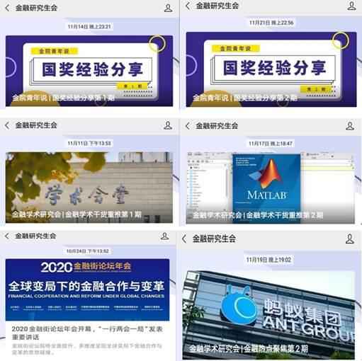 借助学院官网、学院公众号、学院党支部公众号、研究生会公众号、中财金院职业发展助手公众号等多媒体平台开展广泛宣传,推出奋斗金融人、国奖获得者经验分享、金融学术干货、金融热点聚焦、职发周报等50余篇内容丰富的推送。