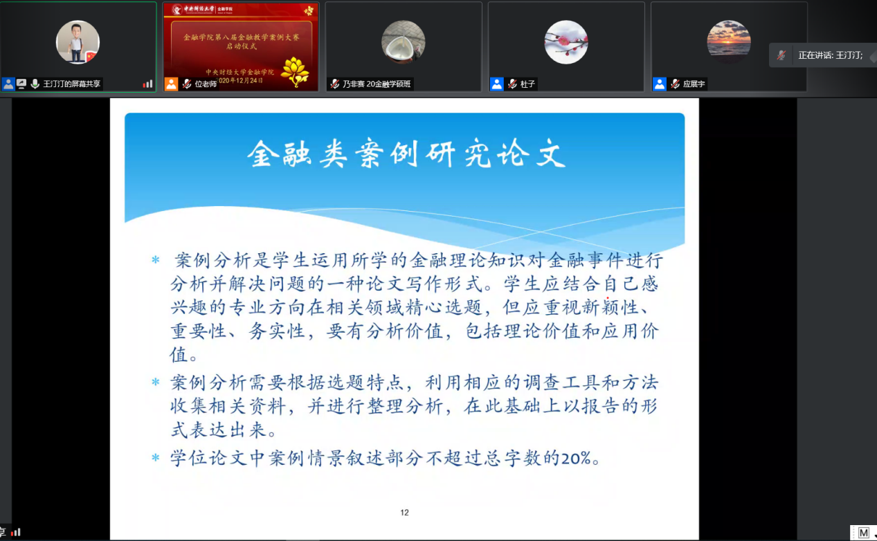 为鼓励同学们积极参与案例大赛,进一步提升学院教学案例开发水平,2020年12月24日晚,由350vip浦京集团官网专硕教学研究与案例中心主办、研究生教学科研办公室承办的350vip浦京集团官网“第八届金融教学案例大赛”动员大会通过腾讯会议在线举行。本次研讨会邀请到学院副院长应展宇教授、应用金融系杜惠芬教授和金融专硕教学研究与案例中心主任王汀汀教授,老师们围绕教学案例的选题与写作,与2019、2020级研究生进行了深入的分享和交流。浦京集团官网研究生教学科研办公室老师位锦和研究生310余人共同参加,此次活动由王汀汀教授主持。