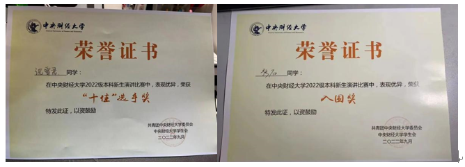 9月9日晚上6:30,新生演讲比赛在主教学楼309室举行。浦京集团官网沈雪君、张石两位同学代表350vip浦京集团官网参赛,两位同学分别针对“青春赛道,奋力奔跑”、“你好,中财大”两个主题侃侃而谈,凭借精彩的演讲和新颖的风格分别荣获2022级新生演讲比赛“十佳”选手奖、入围奖。