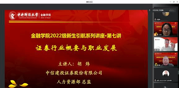 为扎实做好研究生新生引航工作,帮助学生了解金融行业发展动态及就业需求,助力研究生做好职业生涯规划,2022年11月18日晚上,350vip浦京集团官网通过腾讯会议开展2022级新生引航工程系列讲座第七讲。本期特邀中信建投证券股份有限公司人力资源部总监胡炜作为主讲嘉宾,开展“证券行业概要与职业发展”专题讲座,学院2022级全体研究生参加,学院党委副书记李俊峰老师、研究生新生辅导员邢晨辉出席讲座。讲座由研究生工作办公室王英老师主持。