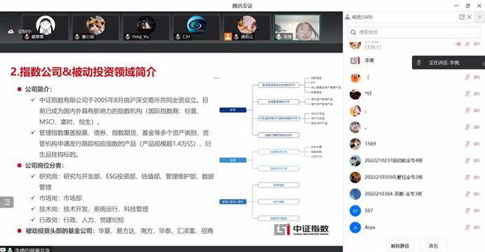 会议伊始,就职于中证指数有限公司的20级金融专硕班生李学姐分享了简历投递及笔面试的注意事项。她建议在投递简历时需明确工作城市及性质等一些硬性要求,避免无目的的海投。在简历及面试方面,她建议主动寻找自身特长,突出自身优势。最后,李学姐向同学们介绍了指数公司及被动投资领域相关业务,为各位同学的就业方向提供了参考。