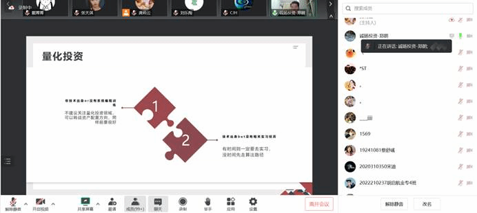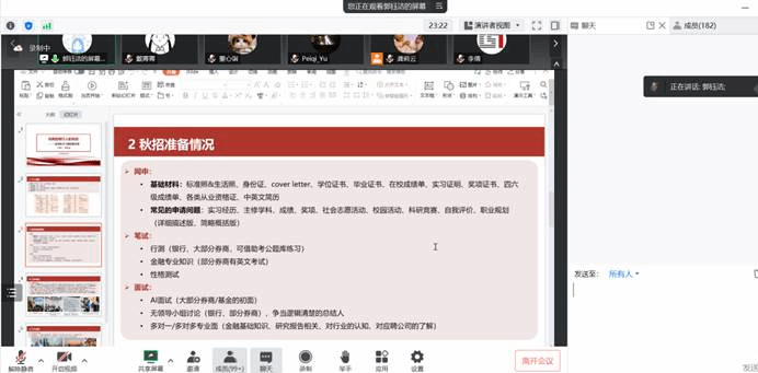 最后就职于中信建投证券市场风险管理部的19级金融科技班的陈学长向大家介绍了风险管理部团队、业务情况及资管岗位情况。他向大家推荐了《金融求职宝典》,建议多与同事交流,通过各公众号、软件主动学习,提升自身专业知识;同时,也建议争取在校考取完CPA、CFA等专业证书,加强竞争力。此外,他还简单介绍了建投实习内容及留用情况,希望大家面试可以放平心态、不必紧张。