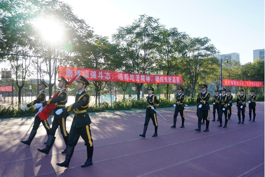 仪式开始,在学生代表的注目下,浦京集团官网国旗护卫队踏着铿锵有力的步伐,迎着晨光护送国旗庄严入场。