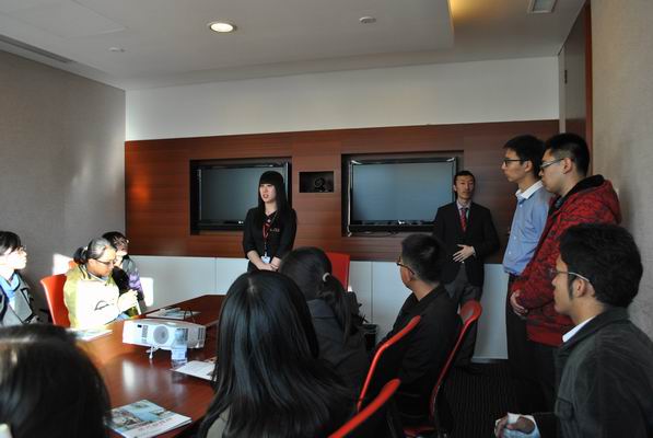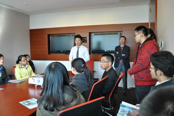 同学们进入法兴银行后,来到一个18层会议室。女职员April首先为大家简单介绍了银行的分类和法兴银行的主要经营范围,让原本有些拘谨的同学们放松了许多。接着,刚毕业不久进入法兴银行的王正央给大家讲了自己的一些心得体会。他认为大学生在大学中一定要加入适合自己的社团组织,要精而不能泛,这样个人能力才能得到提高;并且每个人一定要尽快找准自己的定位,明确自己毕业后的发展方向。他精彩的讲解得到了大家热烈的掌声。