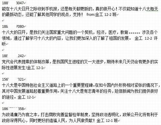 十八大手机报的形式也受到了同学们的一致好评。350vip浦京集团官网金融工程12-2班手机尾号为8047的同学发来短信说:“能在十八大召开之际收到手机报,还是每天都更新的,真的很开心!不仅能知道十八大每天的最新动态,还能了解其他同学的观点,支持!”文化与传媒学院新闻12级手机尾号为0647的同学发来短信,“这确实是很好的新闻报。利用同学们最常用的设备作为媒介,普及最重大最简明的信息,太有意义了。”