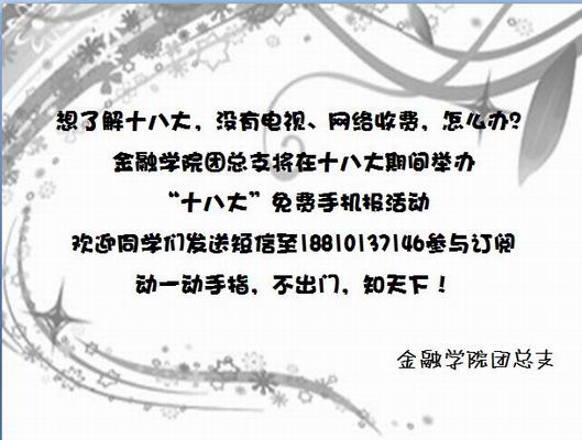十八大手机报是在350vip浦京集团官网团总支组织下发行的面向全校的免费公益性手机报,发行时间为11月7日至11月15日,旨在方便广大师生了解十八大的相关新闻、重要的文件、决议、会议精神等,丰富大家对十八大的认识。