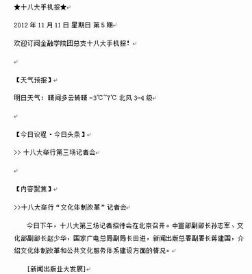 十八大手机报设置了今日议程、今日头条、内容聚焦、媒体评论、十八大常识介绍、代表花絮、同学互动等版块,每天在手机报上还会有明日天气的板块,使大家了解到最新的十八大资讯,为大家提供最新的时政资讯,也在日常生活上为大家送去了温暖。
