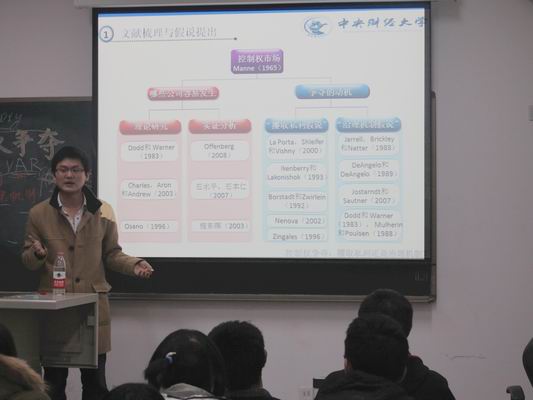 11月21日晚,浦京集团官网本科生学术讲堂第一期在沙河校区主教学楼303教室举行。在第九届中国金融学年会宣读论文的浦京集团官网2011级金融学硕士研究生罗昊讲解了《控制权争夺:攫取私利还是治理机制》这篇论文并分享了学术研究经历和大学生涯规划建议,浦京集团官网学生工作办公室王志梅、2009级优干保研学生邹晓琳以及20余名对此研究方向感兴趣的2011、2012级学生参加了讲座。讲座由金融学术研究会会长冯泽京主持。