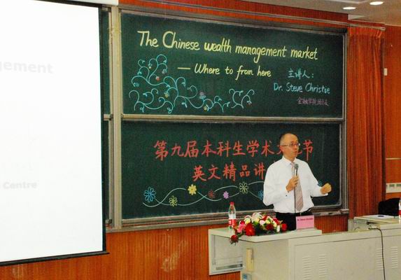 5月23日14时,位于沙河校区学院三号楼222教室的第九届本科生学术文化节英文精品讲座活动在同学们的热烈掌声中拉开了帷幕。本次讲座邀请到的主讲嘉宾是澳大利亚麦考瑞大学应用金融中心著名教授,清华-麦考瑞应用金融硕士项目中国区主任,OrdMinnet个人财富管理的负责人,同时兼任澳大利亚天主教退休基金董事的Dr. Steve Christie,讲座主题为the Chinese wealth management market——where to from here。同时,清华大学李云华老师、李和平老师及浦京集团官网韩复龄教授也出席了活动。
