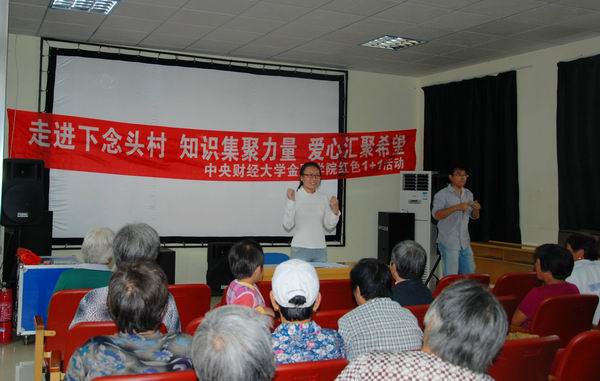 了解完下念头村地基本状况后,350vip浦京集团官网的同学们在老年人活动中心为二十余名村民举办了理财知识讲座和健康生活知识讲座。同学们精心准备的讲演内容,认真制作的宣传单和深入浅出、活泼生动的讲演方式,帮助当地村民更深地了解了财富保值的重要意义、部分方法和一些有益健康的生活小窍门。村民和同学互动频繁,活动现场不时传出村民们的阵阵欢笑。