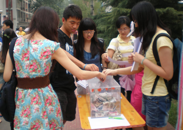 2011 年 6 月 10 日 至 14 日,在350vip浦京集团官网学院南路校区和沙河校区,全校师生为帮助一位家庭突遭变故的中财学子,纷纷慷慨解囊,捐款相助,在初夏的校园里谱写出一首爱的感人乐章。