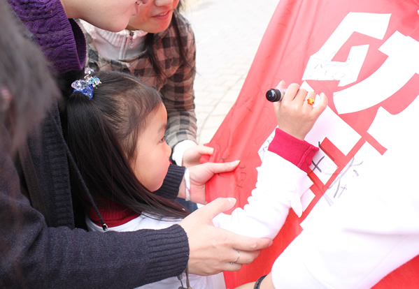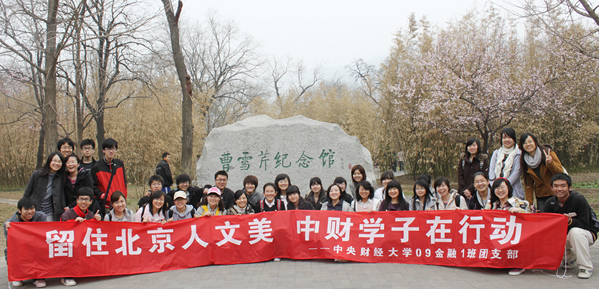 在曹雪芹故居前,同学们将印有“留住北京人文美,中财学子在行动”横幅展开,向游客发放印有人文知识的精美宣传单,并向游客进行宣讲。许多游客都驻足,饶有兴趣地看着传单,聆听着同学们的发言。更有不少游客在横幅上留下了自己对北京文物保护的美好希冀,有来自比利时的外国友人,有同样来自中财金融的 07 级师兄,还有很多小朋友。