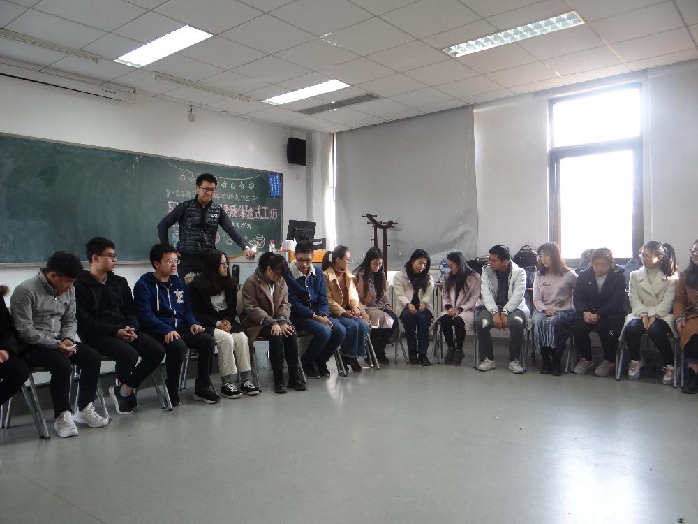 活动伊始,刘琦老师安排了“大风吹”的破冰游戏,使同学们相互认识。大家围成一个大圆圈,任选一位同学站在圆圈中心,并说出在场同学所具有的两个及以上的特征,具有该特征的同学需要交换位置,而没有找到座位的同学将在圆心中央做自我介绍。游戏初期,大家比较拘谨,随着游戏的深入,同学们间的陌生感消失而默契程度加强。刘老师提醒大家,要在游戏中思考自己情感变化及面临各种情况时的反应,从而进一步了解自己的内在特征。为了让同学们进一步加强了彼此之间的了解,刘琦老师开展“同心圆”活动,他让同学们轮流说出自己的兴趣爱好,兴趣相同者组建成新的团队,并喊出口号,以增强成员间的认同感。“天仙配”活动是同学们根据手中发到的不同人名两两组队,交流人物故事,挖掘名人背后的成功品质。