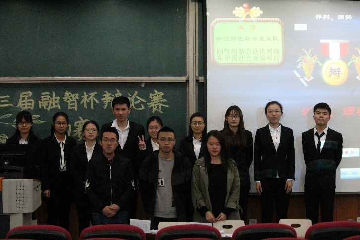 最后一场比赛在16点40分开始,辩题是“同性婚姻合法化对中国社会来说是否可行”。正反方分别是来自国货16-1的“中国特色社会主义队”和来自金工17-1、17-2的“勇战群儒队”,双方则从人权、制度等方面展开了陈词与辩驳。