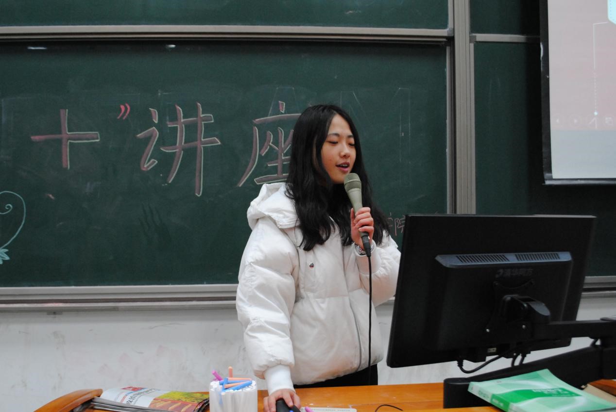 讲座接近尾声,国际金融的“芮+”导师郭嘉晏学姐上台分享作为‘芮+’导师的心理、体验与收获。学姐谆谆善诱,从如何面试、如何协调工作与学习生活、如何高效和学生工作的意义与收获等问题层层展开,最后更以“团史团情,井冈山实践分享”的经历精彩收尾,赢得在场同学的热烈掌声。
