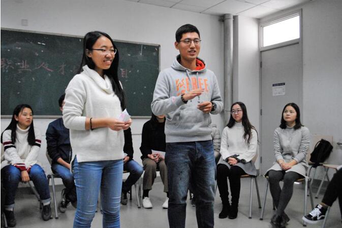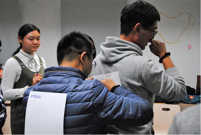下午,在悠扬的乐曲声中,刘琦老师开始了职业心理体验与自我探索课程。他在每位同学背后贴上知名人物的名字,并通过讨论充分挖掘这些成功人士所具备的职业素养;他用沉稳柔和的语调引导同学们闭目冥想,进行自我探索与思考。随后,他让同学们在纸条上匿名写下自己对未来职业的期许与担忧,并让每个同学抽取一个纸条,讲述自己是否有相似的经历或困惑。同学们听完他人的讲述后点头或鼓掌,表示认同。面对手中小小的纸条,大家不仅希望能为他人排忧解 难,更能感受到集体的支持与理解。