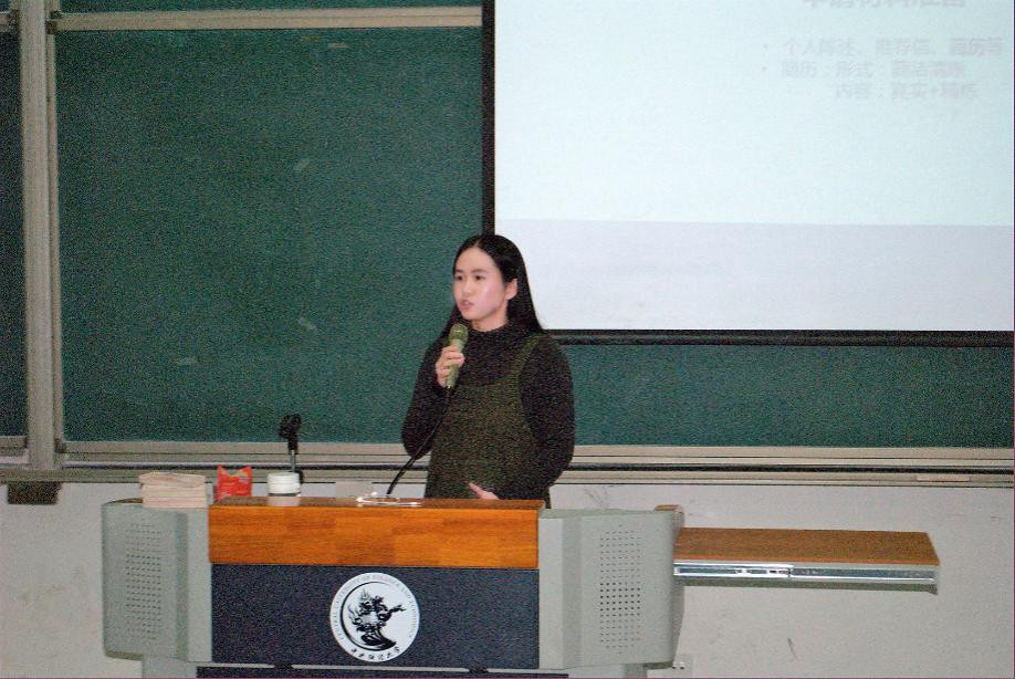 在获取保研资格这一方面,同样保研至北大光华的金工14-1的伍蕾蕾学姐则给同学们进行了详尽的介绍。从简历准备、个人陈述、成绩单、证书复印件以及论文的制作,到笔试环节、单面与无领导小组讨论,每一个流程细节她都详细说明,令在场同学也是收获颇丰。