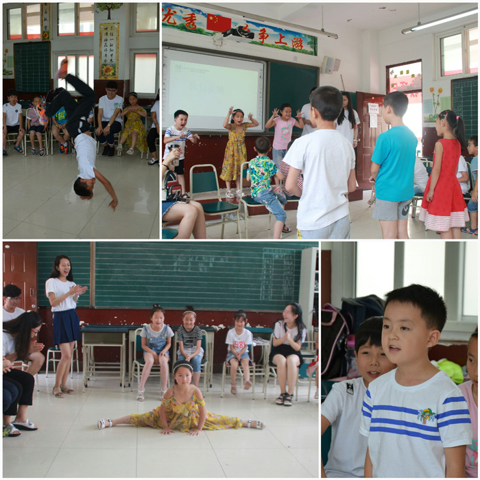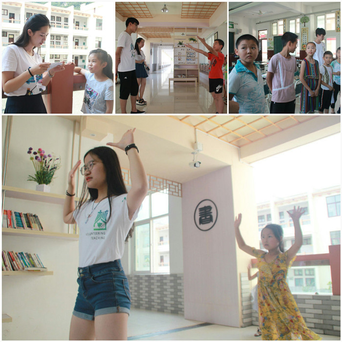随后,队长杨容介绍了队伍组成、支教课程以及接送中的安全事项,各组组员则进行自我介绍与课程内容介绍。在接下来的破冰环节中,团队成员与小营员们通过“大风吹”、“你划我猜”、“你画我猜”与“谁是卧底”的游戏加深了相互之间的了解。同学们或是赢得了零食奖励,或是接受惩罚,表演了背古诗、讲笑话、唱歌、劈叉、侧手翻等各种节目。现场笑声不断,气氛活跃。