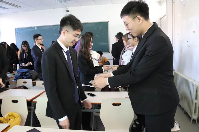 贾媛媛老师就仪态风度礼仪、商务会面礼仪、商务接待礼仪三个方面展开了详细而生动的讲解。“仓廪实而知礼节,衣食足而知荣辱”,贾媛媛老师从一个职场问题突发的场景,引导同学们逐步认识礼仪的重要性。她认为我们应当注意商业礼仪中遵循的“55387”原则,即第一次会面时,7%的印象来自于谈话内容,38%来自于语音语调,55%来自于外表。随后,贾媛媛老师深入讲解了职场穿搭与妆容要求。在正式商务场合,女士应当穿职业套裙、束发、化淡妆;男士应当穿黑色正装,不留胡须,头发“前不及眉,旁不附耳,后不及领”。根据商务环境的不同穿着要求可进行不同的调整,女士可以选择西装外套和裙子等多种穿搭,男士可以选择深灰色、藏蓝色、深褐色等西装样式。接着,贾媛媛老师对于自我介绍的格式规范进行讲解。她认为“寒暄+姓名+归属地+职位”是自我介绍的标准公式,还需要说明双方的关系以更快得建立联系。若是作为中间人,应该遵从“位尊者具有优先知情权”的原则,先将“位卑者”介绍给“位尊者”。而后,贾媛媛老师从案例出发,对于如何握手进行了解读。关于握手的礼仪,贾老师进行细致的讲解并和同学配合做出示范。正确的握手方式应是立正姿势,上体前倾,掌心相交,力度七分,时间三秒,面带微笑,微微点头,口有敬语。此外,在商务接待礼仪方面中,贾媛媛老师重点介绍了位次礼仪,她指出了5个重要原则:面门为上、居中为上、以右为上、前排为上、以远为上。课程中,贾媛媛老师还组织同学们进行实操训练。老师亲自示范并讲解站姿、蹲姿,商务接待等动作的细节要求,并耐心纠正同学们的错误。