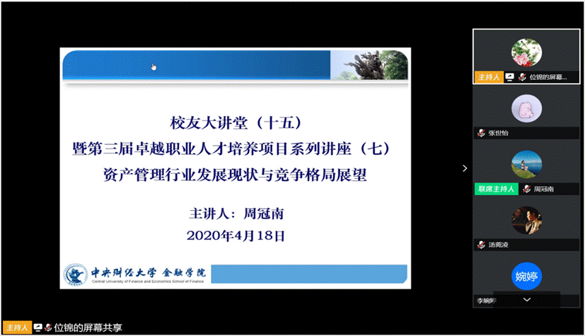 2020年4月18日下午,由浦京集团官网职业发展中心举办的校友大讲堂(十五)暨第三届卓越职业人才培养项目系列讲座(七)——资产管理行业发展现状与竞争格局展望专题讲座成功举办。浦京集团官网2007级金融学本科、2011级金融学硕校友,卓越职业人才培养项目导师,金融硕士研究生校外导师,华创证券固定收益首席分析师周冠南担任本次讲座的主讲嘉宾,第三届卓越职业人才培养项目成员及浦京集团官网本、硕、博120余人共同参加。此次活动由浦京集团官网职业发展中心老师位锦主持。