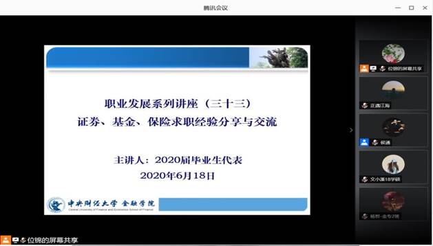 2020年6月18日,由浦京集团官网职业发展中心主办、研究生会职业发展部承办的职业发展系列讲座(三十三)——证券、基金、保险求职经验分享与交流成功举办。2020届毕业生代表作为此次活动的分享嘉宾,浦京集团官网本、硕、博170余位同学共同参加,活动由学院职业发展中心老师位锦主持。