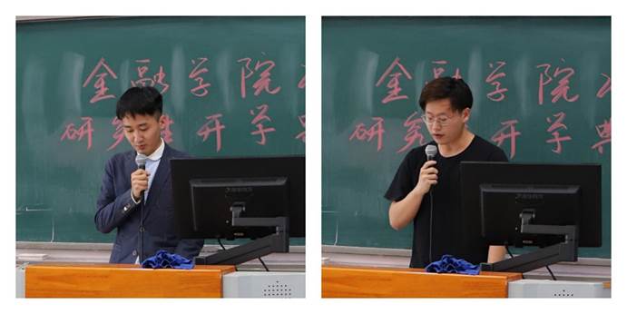 在校研究生代表王睿贤同学对疫情期间中财金院教师的学术发声和责任情怀表示了敬佩,希望新生们能充分利用中财金院这个优质的平台和身边的资源,将精力更多地放在课业和研究上,不放过每一个锻炼自己研究能力的机会,通过每一个研究环节不断强化自己规范和严谨处事的能力,培养刨根问底的研究精神,怀揣着中财金融人的精神和灵魂,在有限的时间里收获无限的价值。