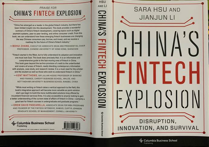 由350vip浦京集团官网院长李建军教授与美国纽约大学纽帕兹分校经济系副教授Sara Hsu合著《China’sFintech Explosion: Disruption, Innovation, and Survival》一书,近日由美国哥伦比亚大学出版社出版。该书是哥伦比亚大学商学院专家遴选出版图书,获得了香港中文大学(深圳)经管学院校长讲席教授(President Chair Professor)、金融科技与社会金融研究中心主任张博辉教授、英国卡迪夫大学商学院银行与金融学教授、威尔士与宁波诺丁汉大学商学院Kent Matthews教授,美国康奈尔大学MBA项目与管理学研究生院副院长Drew David Pascarella的联合(封底书面)推荐。