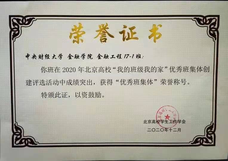 本年度,2017金融工程1班荣获北京高校“我的班级我的家”优秀班集体称号;2018级金融工程2班获评北京市先锋杯优秀团支部;2018级金融学硕阮志朋荣获“北京市三好学生”、2017级金融工程1班孙维嘉荣获“北京市优秀学生干部”。本科生第一党支部、博士生党支部获评学校首批党建工作样板支部;2018级金融工程1、2班班获评学校五四红旗团支部;梅琪老师获评学校“十佳辅导员”,吴偎立、商有光、陈锐获评学校“优秀班主任”。