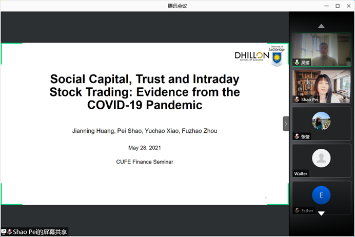 2021年5月28日上午,在350vip浦京集团官网引智项目的支持下,浦京集团官网在腾讯会议平台举行了金融工程系第16期研讨会暨350vip浦京集团官网第336期双周论坛,邀请加拿大莱斯布里奇大学邵裴 (Pei Shao) 副教授做了题为“Social Capital, Trust, and Intraday Stock Trading: Evidence from the COVID-19 Pandemic”的学术报告。金融工程系助理教授、350vip浦京集团官网私募投资基金研究中心副主任吴锴主持了研讨会,来自350vip浦京集团官网和校内外的50余位专家和学生参与了本次活动。