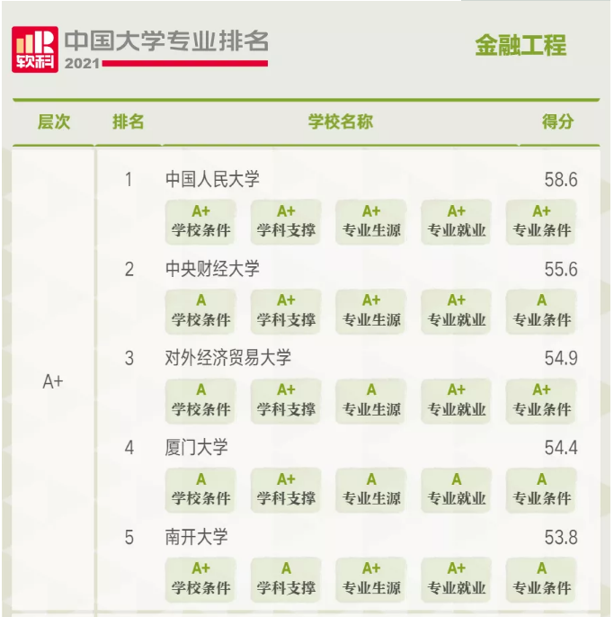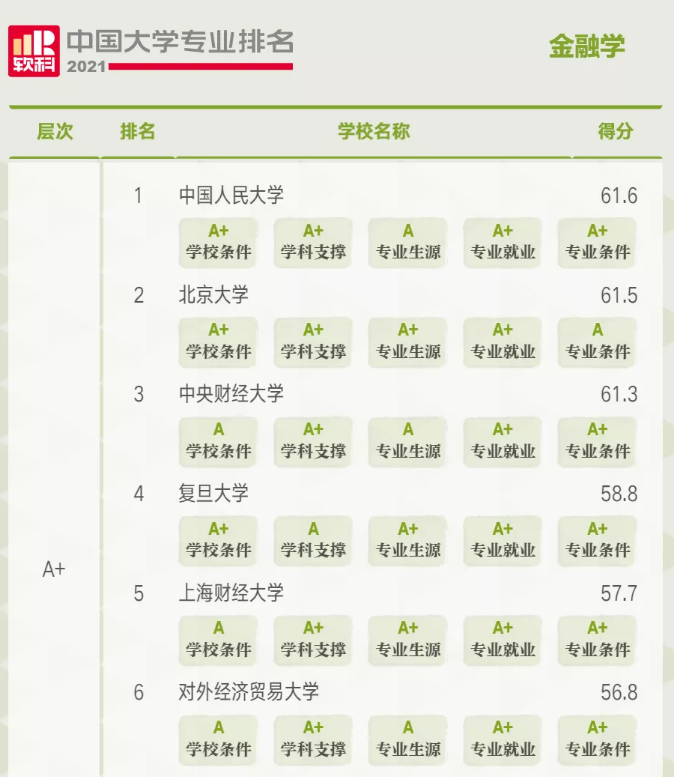 6月22日,高等教育评价专业机构软科正式发布2021“软科中国大学专业排名”。软科以全国排名前2%或前2名作为A+专业入选标准,浦京集团官网全部三个专业均获得A+等级且位列前三甲。其中,金融学专业在上榜的201个专业点中位列第3,金融工程专业在上榜的136个专业点中位列第2,金融科技专业在上榜的9个专业点中位列第1。