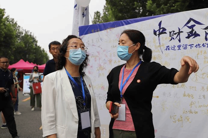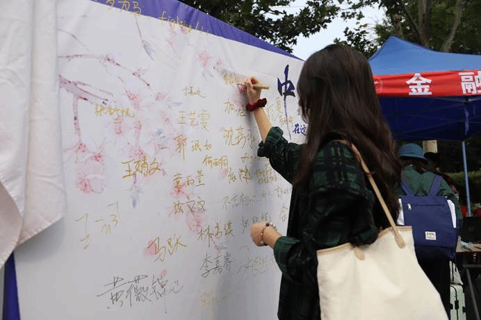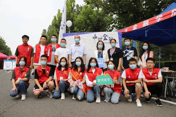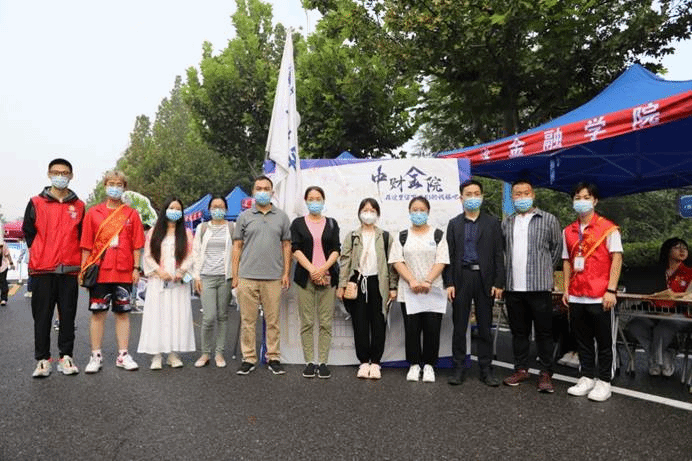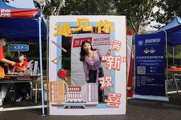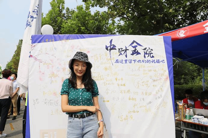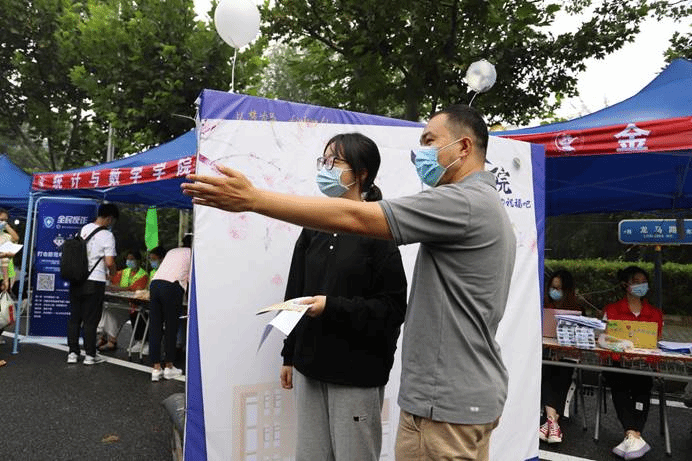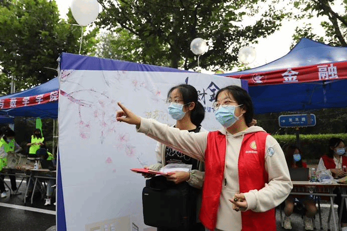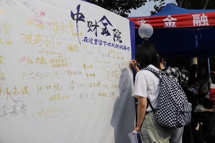 作为中财大院,金院的报道点也有许多亮点:象征着金彩金院的白金金属气球装饰着迎新棚,志愿者可以手持的青春标语KT板,新生可以寄语留念的祝福墙,以及带有学院标识的合照板,处处精心的布置彰显了学院对新生的美好期许。