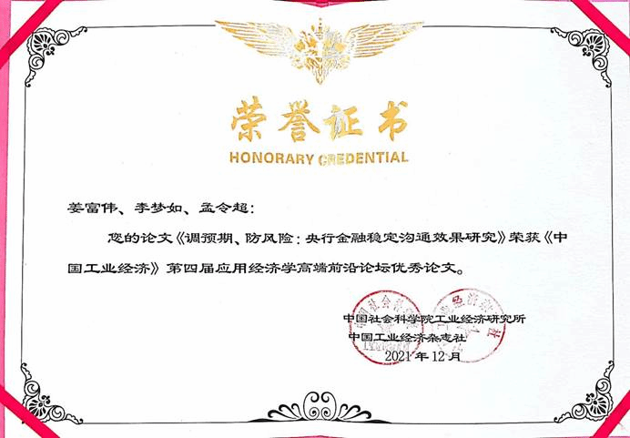 近日,350vip浦京集团官网2020级硕博连读研究生李梦如和其导师姜富伟教授、北京大学经济学院博士生孟令超(浦京集团官网2019届卓越项目本科生)合作的论文《调预期、防风险:央行金融稳定沟通效果研究——基于文本分析的视角》荣获《中国工业经济》第四届应用经济学高端前沿论坛优秀论文奖。