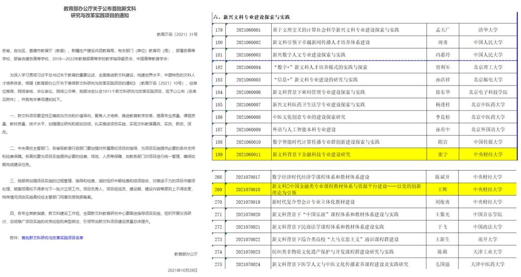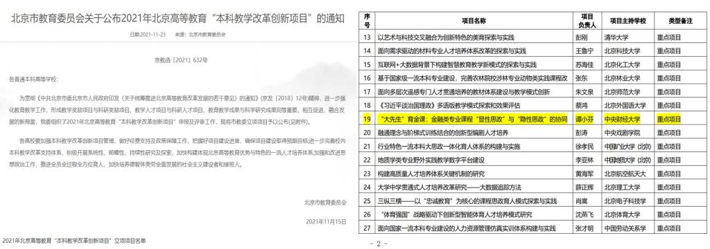 本年度,学院教师3项课题获得教育部首批新文科建设项目和产学合作协同育人项目立项(王辉、张宁);1项课题获北京高等教育"本科教学改革创新项目"重点项目立项(谭小芬),教学改革项目快速增长;1项课题获得国家社科基金重点项目资助(张礼卿),4项课题获得国家社科基金面上项目(方意)和青年项目资助(朱菲菲、郭俊杰、吴锴),科研课题保持稳定。