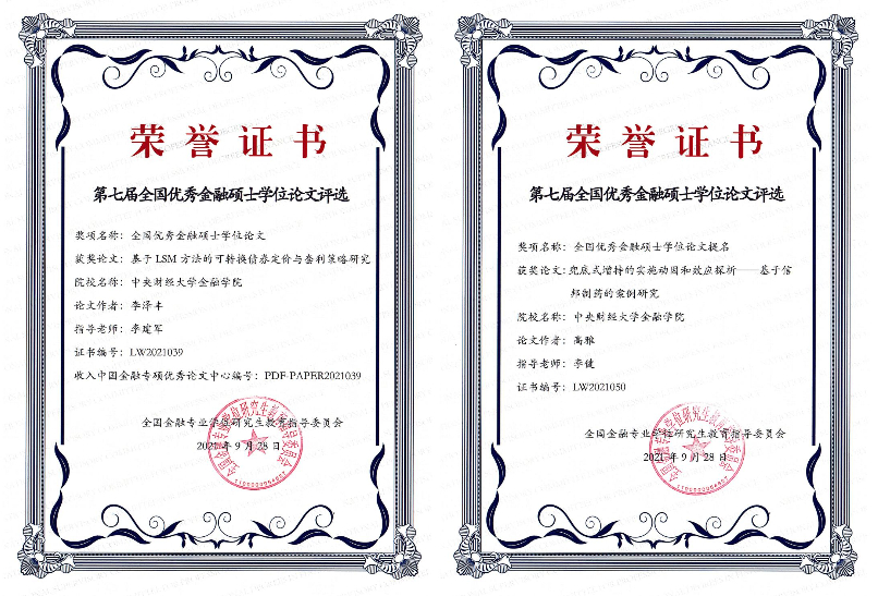 10月,全国金融专业学位研究生教育指导委员会发布《关于第七届全国优秀金融硕士学位论文评选结果的通知》,浦京集团官网两篇论文分别获得全国金融硕士学位论文优秀奖(作者:李泽丰,指导教师:李建军)和提名奖(作者:高雅,指导教师:李健)。
