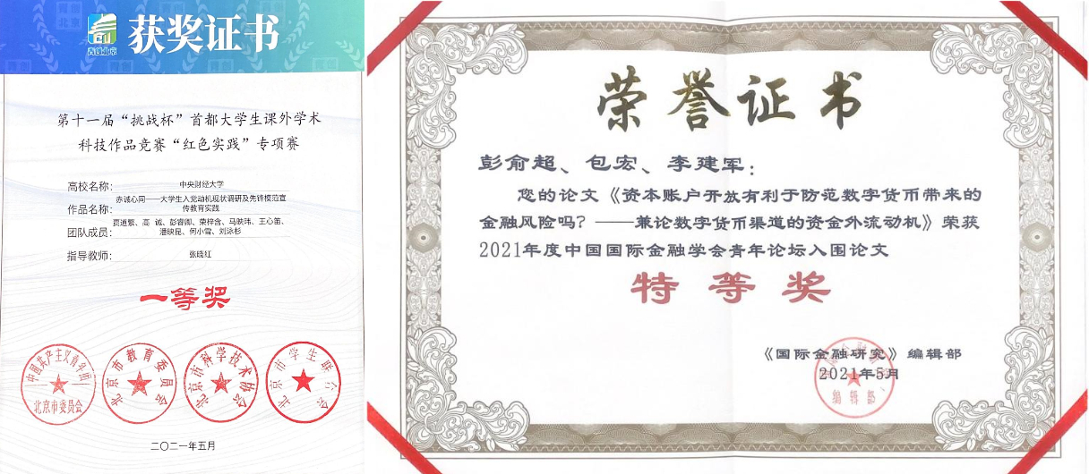 2021年,学院11名本科生荣获第十一届挑战杯“红色实践”专项赛北京市一等奖;1名本科生荣获北京市“穿越时空的对话”一等奖;1个团支部获评北京市先锋杯团支部;1人获评“北京市三好学生;卓越项目学生在《经济学(季刊)》《金融研究》等高水平期刊发表论文7篇;3名研究生获中国国际金融学会青年论坛特等奖、第四届中国立信金融论坛征文一等奖和第三届中国金融学术与政策论坛(CIFFP)优秀论文奖。