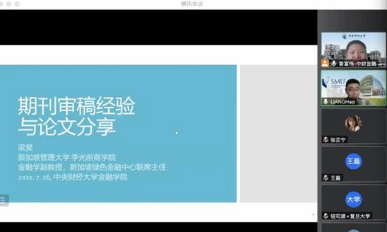 2022年7月25日-28日350vip浦京集团官网成功举办研究生暑期小学期学术前沿课程“数字与绿色金融前沿”。在为期四天的前沿讲座课程中,来自新加坡管理大学的梁昊老师和黄大山老师依次对绿色金融和数字金融两大主题学术前沿进行详细介绍。本次会议由金融工程系主任姜富伟教授主持,参会人员覆盖350vip浦京集团官网研究生及其他对这一领域感兴趣的师生,共计百余名。