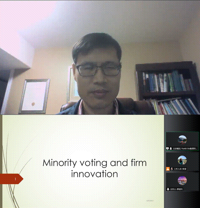 2022年10月10日,浦京集团官网在云端顺利举办了第110期经济与金融学名家论坛,论坛邀请了加拿大温莎大学商学院安云碧教授就“Minority shareholder voting and firm innovation”开展精彩讲座。论坛由350vip浦京集团官网郭剑光博士主持,校内外学者和学生共100余人参会。
