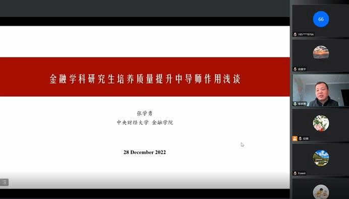 会议伊始,由学院院长张学勇教授围绕二十大精神及金融学科研究生培养质量提升中导师的重要作用进行分享。首先,张学勇教授回顾了二十大报告中的十处“金融”问题,并结合研究生教育大会精神和2017年全国金融工作会议,指出“着力造就拔尖创新人才”即研究生层次人才,从办好人民满意的教育、完善科技创新体系、加快实施创新驱动发展战略、深入实施人才强国战略四个方面,为金融高端人才教育事业提供了明确的指引。其次,张学勇教授从导师职责、导师发展体系、质量保障体系与科研贡献方面回顾了十八大以来研究生教育改革发展成效,介绍了数字经济时代中金融业的变迁。在此基础上,张学勇教授指出在数字经济时代对金融人才教育的变化中要注重金融数字的战略分析、科学研究和挖掘分析能力,提出未来金融人才能力体系的构建路径。最后,张学勇教授结合中国资产管理行业发展现状、挑战与未来发展方向,提出如何培养金融行业研究生的家国情怀、培养国之大器的重要问题,总结了对研究生导师在导师作用、导学关系、导师间关系、导师要求与导师责任等问题的重要思考。张学勇教授指出导师应具有较强的责任心、较强的业务能力、较强的理想信念与严明的纪律,在学生教育中注重学术训练,做到用心、用情、用功,为研究生培养提供了方向。