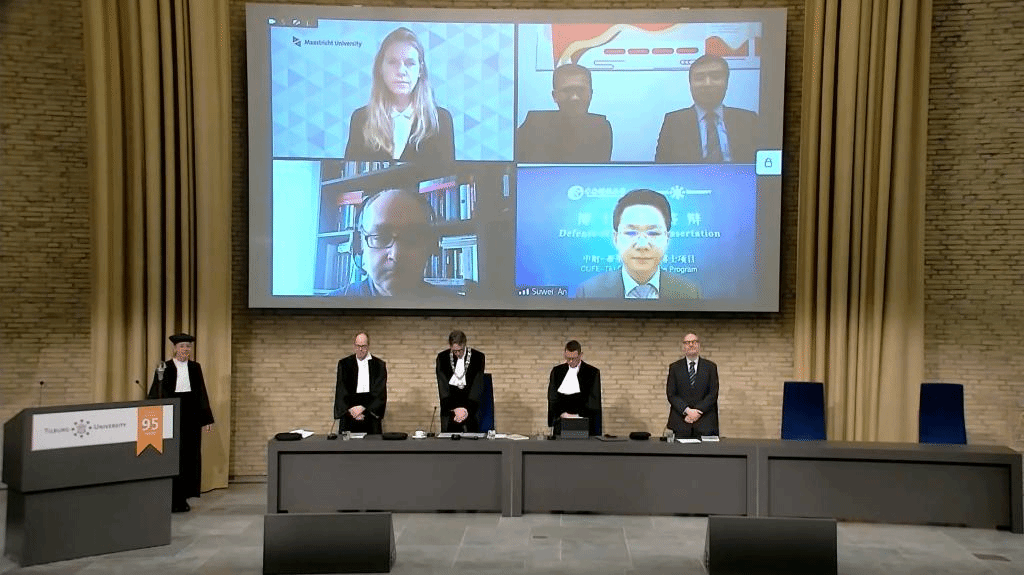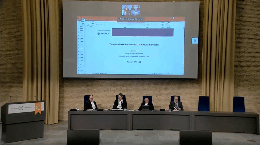 2023年2月17日,中财-蒂尔堡项目博士生学位论文公开答辩仪式在蒂尔堡大学Aula大礼堂举行。浦京集团官网蒂尔堡项目2018级博士生安苏伟在线进行了公开答辩,其导师荷兰蒂尔堡大学Lieven Baele教授、谭小芬教授、吴锴副教授,以及博士委员会成员安特卫普大学Marc Deloof教授、马斯特里赫特大学Rachel Pownall教授、蒂尔堡大学Frans de Roon教授和Peter de Goeij副教授均参加了答辩仪式。