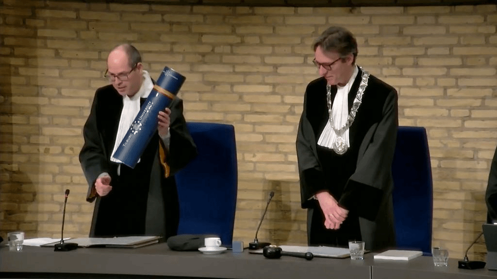 公开答辩仪式历时1.5小时,安苏伟首先对其博士论文进行了12分钟的公开介绍,博士委员会成员接着进行了48分钟的提问,随后仪仗官宣布公开答辩结束。博士委员会成员闭门审议后,决定授予安苏伟蒂尔堡大学博士学位,导师 Lieven Baele教授代表蒂尔堡大学正式宣布授予安苏伟博士学位,博士委员会成员与导师随后逐一对新晋博士表示祝贺,安苏伟博士最后发表感言,答辩仪式圆满结束。