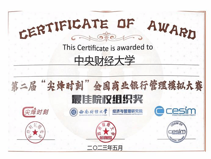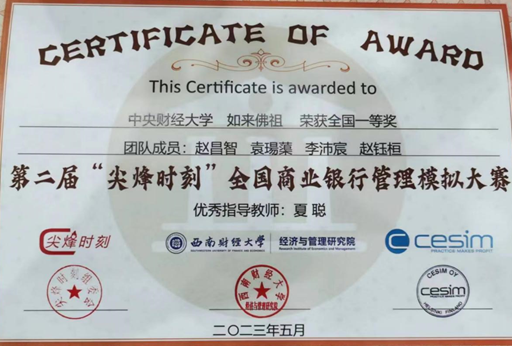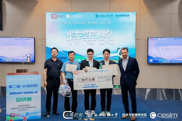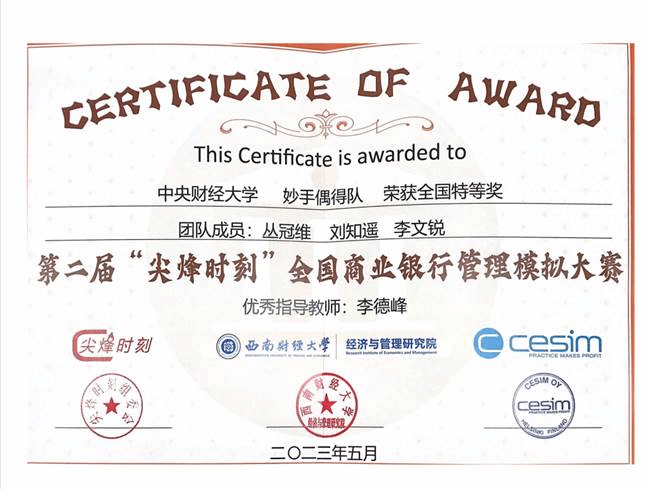 2023年5月21日,在成都西南财经大学举行的第二届“尖烽时刻”全国商业银行管理模拟大赛总决赛圆满结束。作为首次参赛院校,浦京集团官网李德峰老师与夏聪老师指导的2个本科生团队经过激励角逐在总决赛上取得优异成绩:丛冠维、刘知遥组建的“妙手偶得”队在全国20个决赛队伍中拔得头筹,荣获唯一特等奖;赵昌智、袁瑒蕖、李沛宸、赵钰桓组建的“如来佛祖”队荣获一等奖。同时,同时,李德峰和夏聪老师荣获优秀指导教师,350vip浦京集团官网荣获最佳院校组织奖。