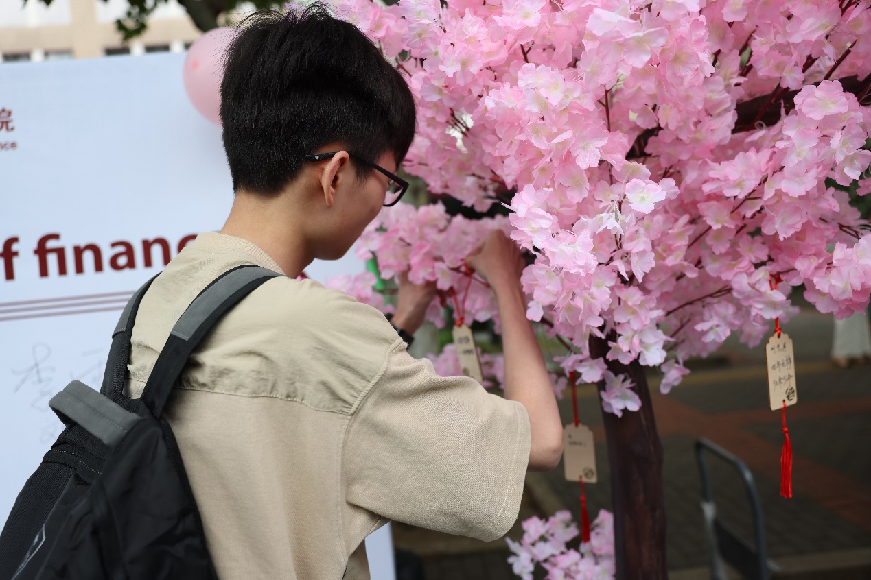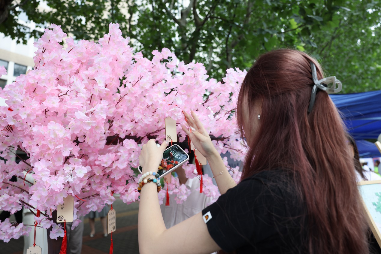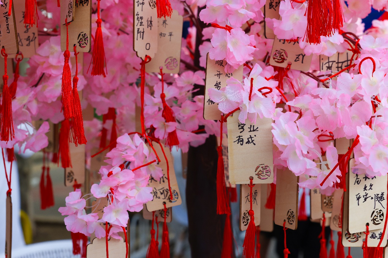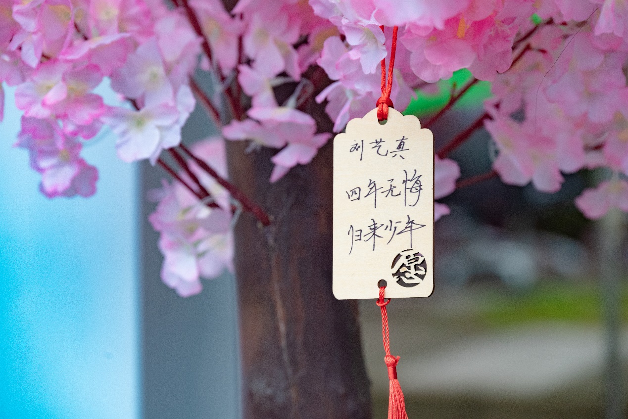 许愿树上悬挂着写有新生愿望的小木牌,学院希望四年后同学们所有的愿望和期许都能实现。