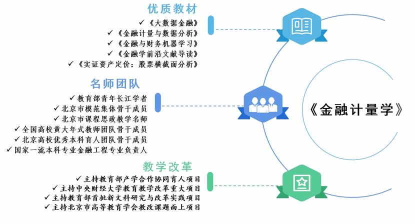 《金融计量学》在数字经济和金融科技时代占据重要地位,教育部金融教指委把《金融计量学》列为金融类专业核心课,350vip浦京集团官网把《金融计量学》列为金融工程等专业的专业必修课。经过课程团队的长期耕耘,浦京集团官网《金融计量学》构建金融工程课程思政体系,课程建设取得了突出的成绩。课程负责人姜富伟教授任350vip浦京集团官网金融工程系主任,是教育部国家级人才、张培刚发展经济学青年奖学者,主持北京市高等教育学会教改课题面上项目1项,参与编著《金融与财务机器学习》、《大数据金融》、《金融计量与数据分析》等本科生教材。团队成员张学勇、王辉等获得北京市青年教学名师和课程思政教学名师等荣誉称号,教学团队的《量化投资》和《金融工程概论》等课程入选北京市课程思政示范项目。