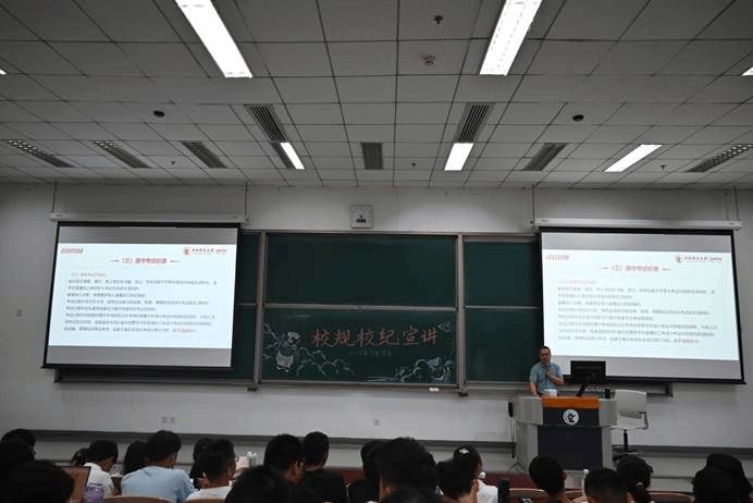 徐老师以对比方式讲述了本科新生进入大学面临的自我评价、发展目标、学习方式、人际交往、生活方式、外部环境、管理方式等方面的变化,介绍了学院的学生发展支持保障体系。他用一个个真实案例,向同学们详细讲解学校学生管理规定、学生违纪处分办法、学籍管理规定等规章制度,并就过一个高质量的大学生活提出建议。他强调,同学们要对违纪典型案例引以为戒,树立纪律意识、规矩意识,严格遵守校规校纪,珍惜宝贵的光阴和机会,锚定目标,追寻人生之使命、兴趣、理想,过有意义的大学生活。