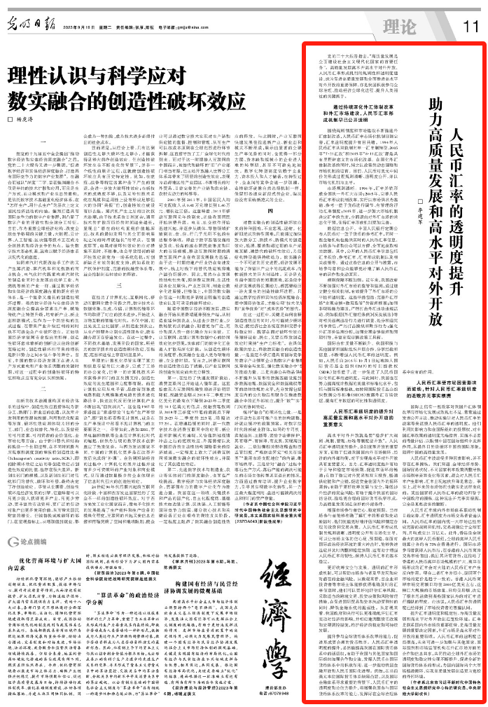9月19日,《光明日报》理论版刊发浦京集团官网副校长李建军教授题为《人民币汇率的透明度提升助力高质量发展和高水平对外开放》的署名文章。文章指出:高质量发展离不开高水平对外开放,人民币汇率形成机制的规则性和透明度建设,成为促进高质量发展和全面推进高水平对外开放的重要保障,亦是我国积极参与全球治理、推动经济全球化进程、提升人类福祉的关键抓手。