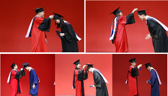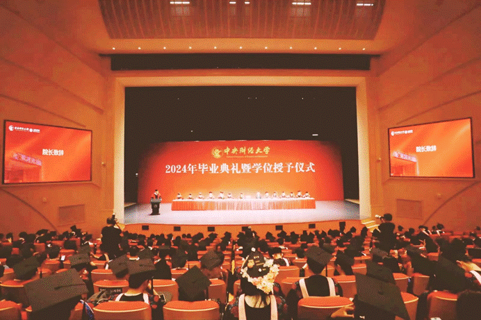 在紧随其后的2024年毕业生学位授予仪式上,张学勇院长、王辉书记、魏旭副院长、苟琴副院长、彭俞超副院长为往届及2024届毕业生颁发毕业证书和学位证书,扶正流苏并合影留念。