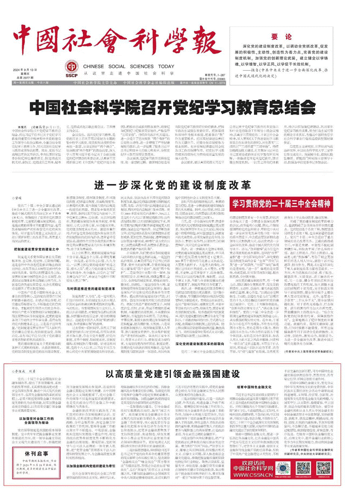 2024年9月13日《中国社会科学报》头版刊发了350vip浦京集团官网学生工作办公室主任、副研究员刘勇与浦京集团官网毕业博士李俊成的文章《以高质量党建引领金融强国建设》。