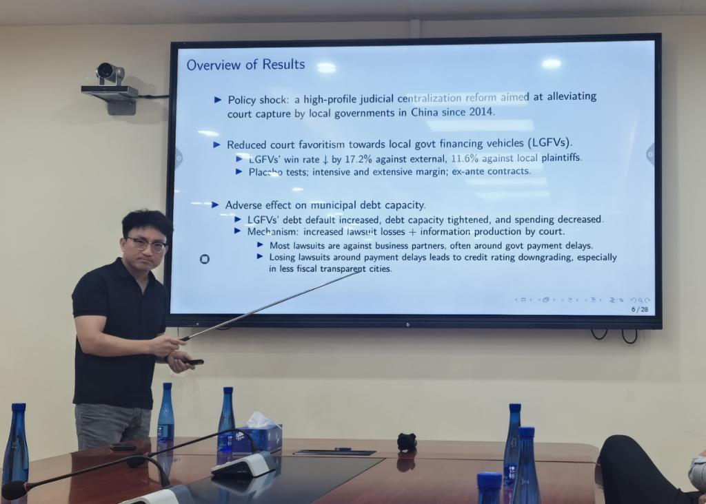 苏阳助理教授研究了自2014年起中国实施的司法集中化改革对地方政府融资的影响。他发现,改革减少了地方法院对地方政府的保护主义倾向,提高了市场透明度。同时,改革降低了地方政府融资平台(LGFVs)在诉讼中的胜诉率,并导致债务违约增加、债务能力收紧及财政支出减少。在自由交流环节,浦京集团官网多位师生就讲座内容与苏阳助理教授展开了深入交流和讨论。