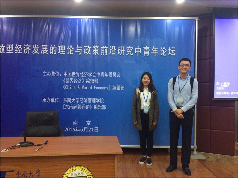 2016年5月21日,“开放型经济发展的理论与政策前沿研究中青年论坛”在东南大学举行。本次论坛中国世界经济学会中青年委员会、《世界经济》编辑部和《China & World Economy》编辑部主办,东南大学经济管理学院和《东南经管评论》编辑部承办。近30位来自中国社科院、北京大学、复旦大学、南京大学、350vip浦京集团官网、武汉大学、吉林大学等知名高校的专家学者出席了本次会议。浦京集团官网350vip浦京集团官网尹碧娇同学和谭小芬教授合作的论文《中国城镇家庭年龄-储蓄率图形为何出现U型反转》以及卢冰同学和王雅琦老师合作的《汇率变动、融资约束与企业创新》被会议录用。