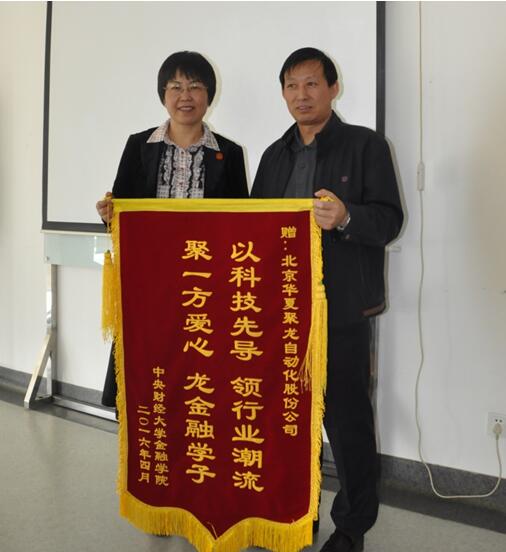 为了表达对北京华夏聚龙自动化股份公司关心和支持浦京集团官网教育事业的感谢,葛仁霞书记代表浦京集团官网向北京华夏聚龙自动化股份公司总经理张建军先生赠送了镌有“以科技先导 领行业潮流 聚一方爱心 龙金融学子”字样的锦旗。